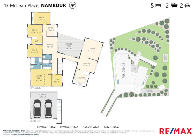 A highset design with a double lock up garage and storage under; the upper level is a pavilion style design comprising five bedrooms, two bathrooms, office, and family room in one wing flowing to a private covered deck/breezeway with lush garden outlook connecting to second wing with living, dining, and kitchen.
