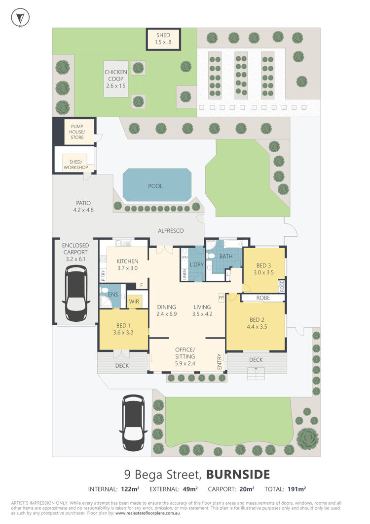 The home itself comprises three bedrooms, two fully tiled bathrooms, elegant Hamptons-style kitchen, office/sunroom, open plan living/dining, expansive private alfresco entertaining area overlooking inground pool, separate laundry, and enclosed carport plus onsite parking, on a 660m2 beautifully landscaped block.