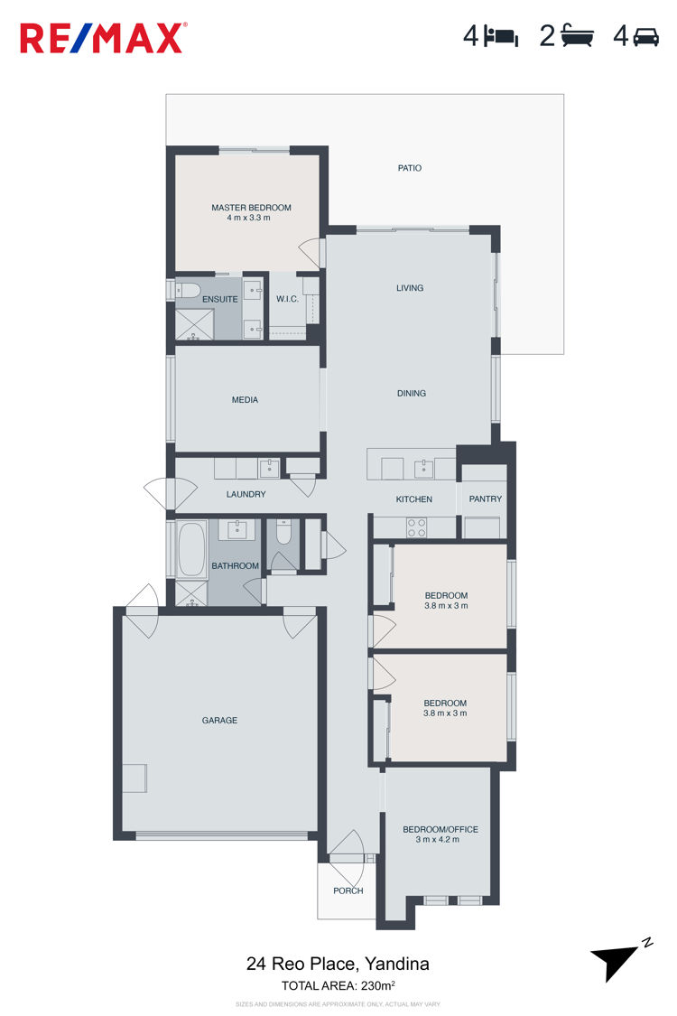 At the end of the hallway the home fully opens up to the large open-plan kitchen and living space, with two external accesses, walk-in pantry, tiled splash-back behind the cooktop, and black fixtures throughout. Nearby the generous media room affords plenty of room to relax and unwind.