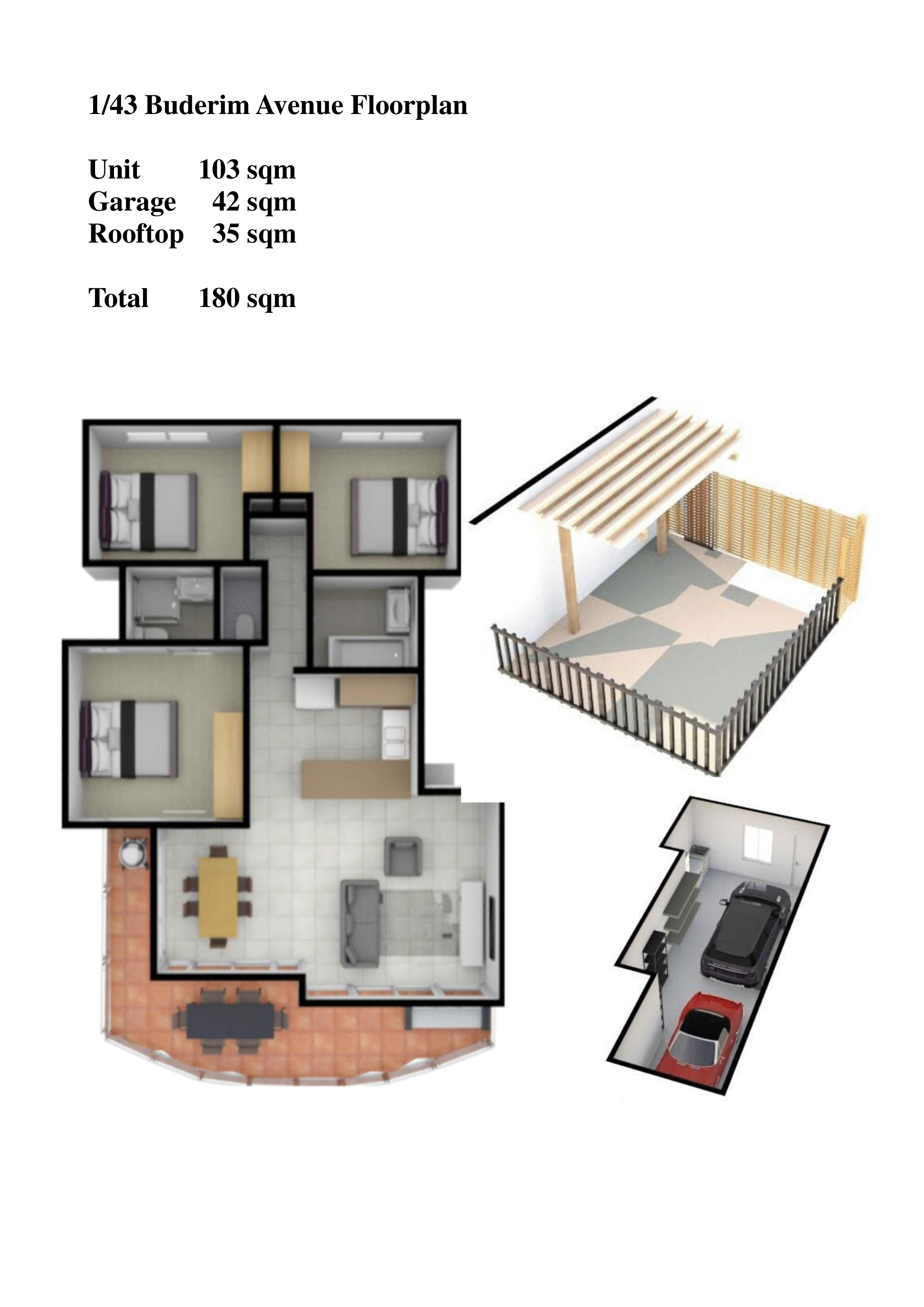 An end first-floor apartment, it comprises three bedrooms, two bathrooms, stylish modern kitchen (recently updated), open plan living and dining flowing out to covered wraparound balcony with north-east aspect, 6.2x5.4m rooftop terrace, and a 44 sqm lock-up garage with tandem parking for two vehicles, plus workbench.