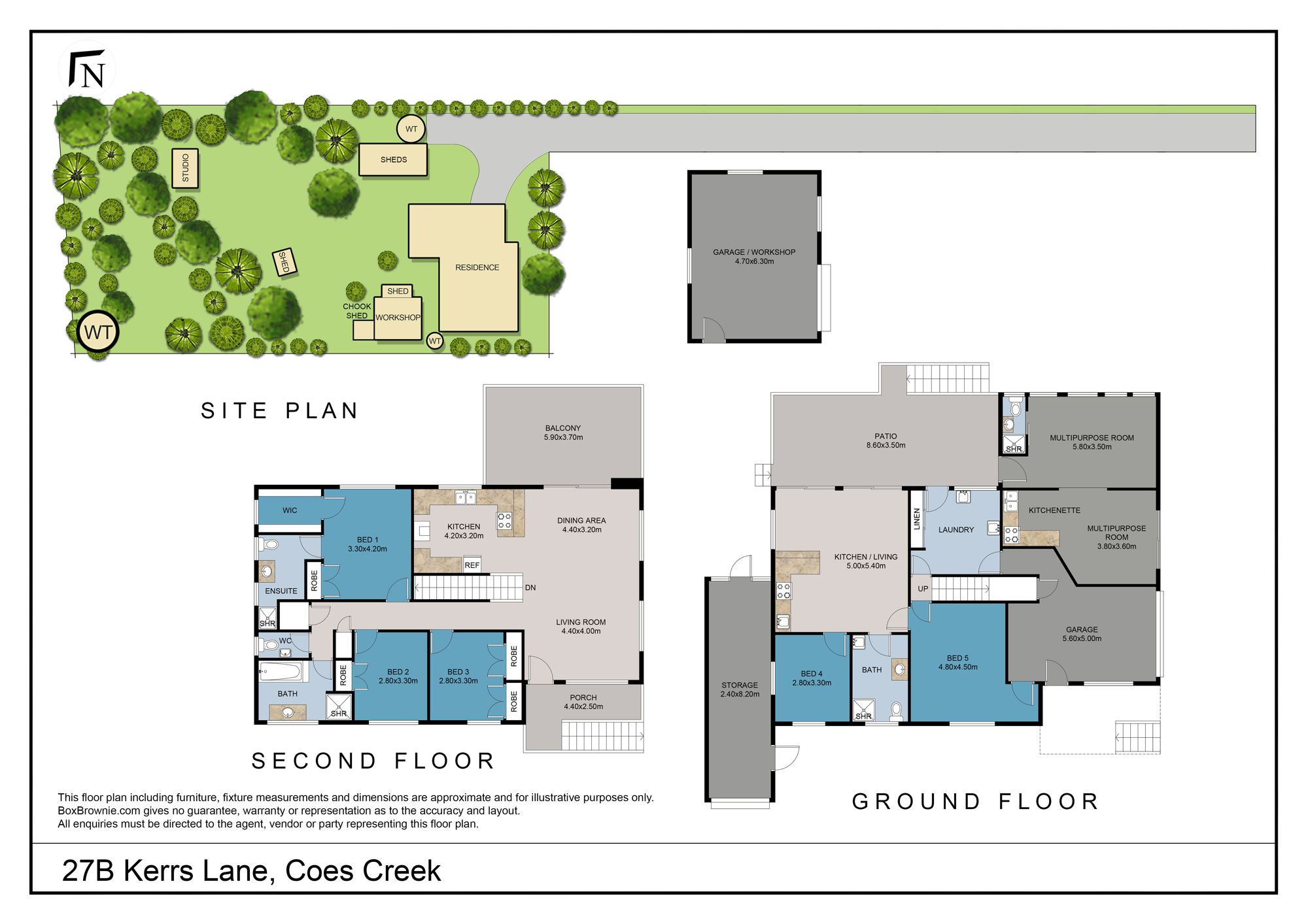 Across two levels the home comprises five bedrooms, four bathrooms, kitchen plus 2 x kitchenettes, separate living areas and multipurpose rooms, upper north-east facing balcony with pleasant rural outlook, covered patio on ground level, separate laundry, and lock up garage.