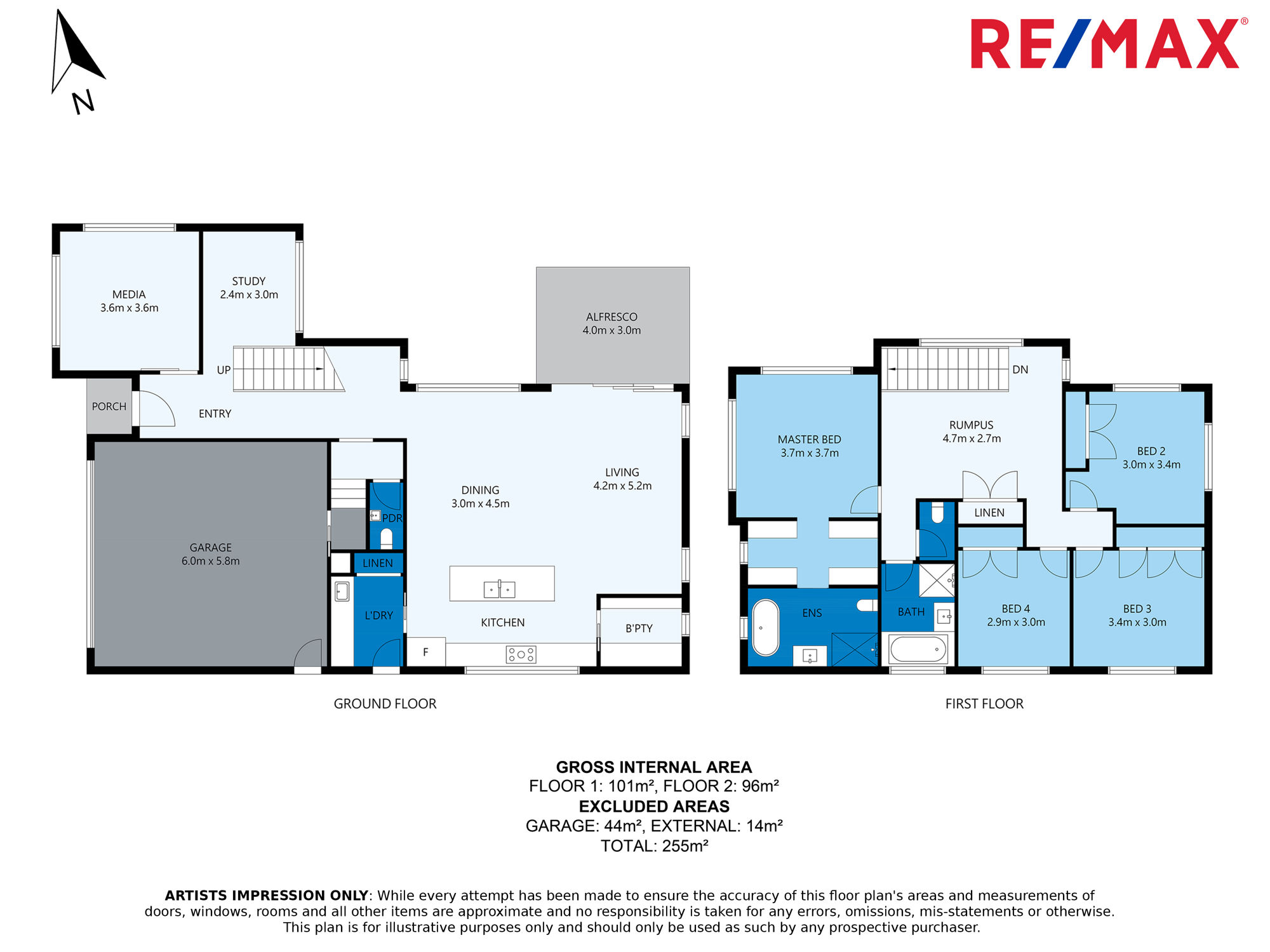 The kitchen, dining and living spaces are located on the lower level, along with a media room, study and laundry. The bright and airy living space opens through sliding doors to a covered alfresco entertaining area, perfect for outdoor dining or family time.