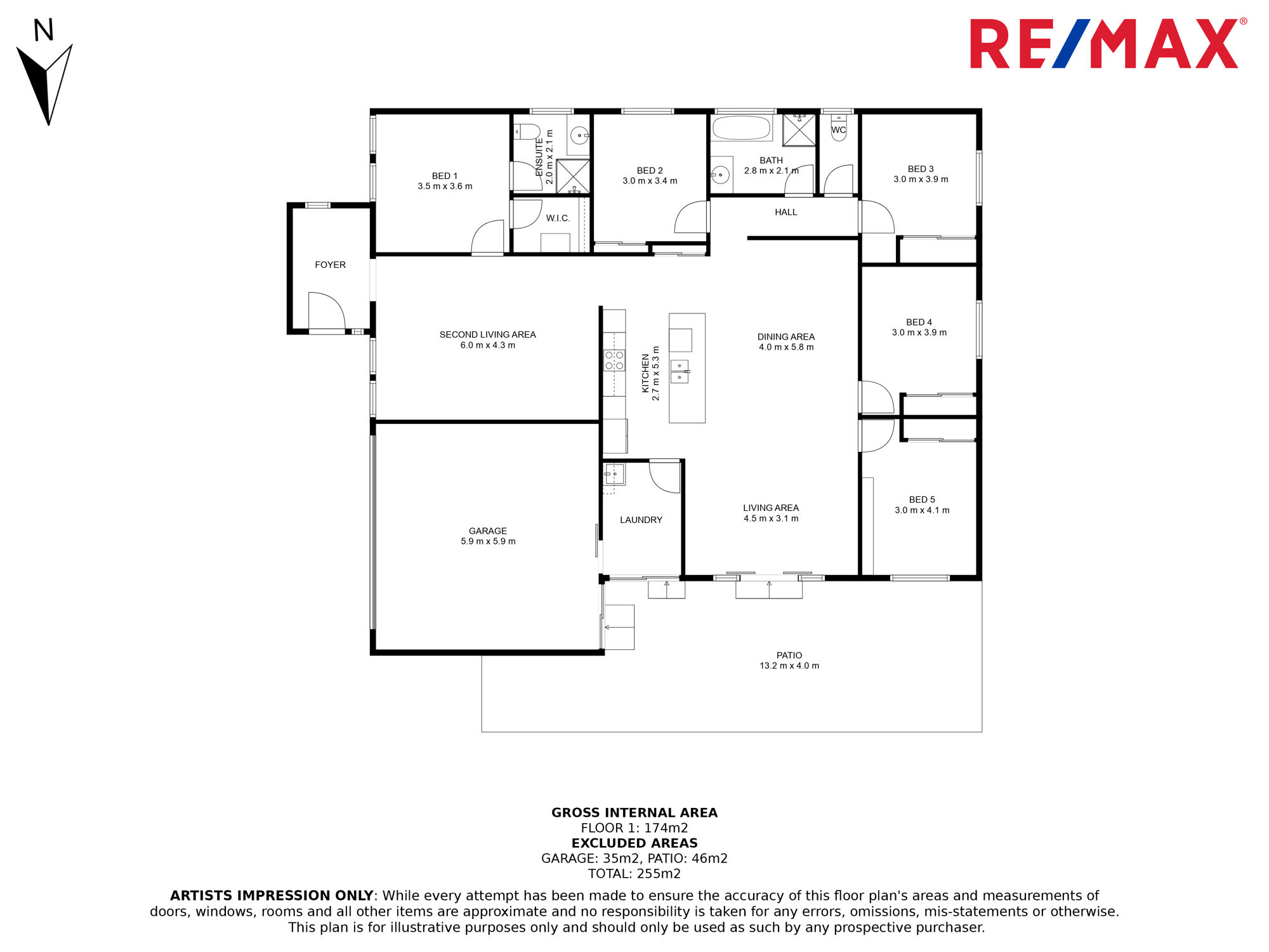 Across a single level the home comprises five bedrooms, two bathrooms, two separate living areas, central galley kitchen, expansive north facing patio, separate laundry, and double lock up garage - it is designed for large or extended family-friendly living.