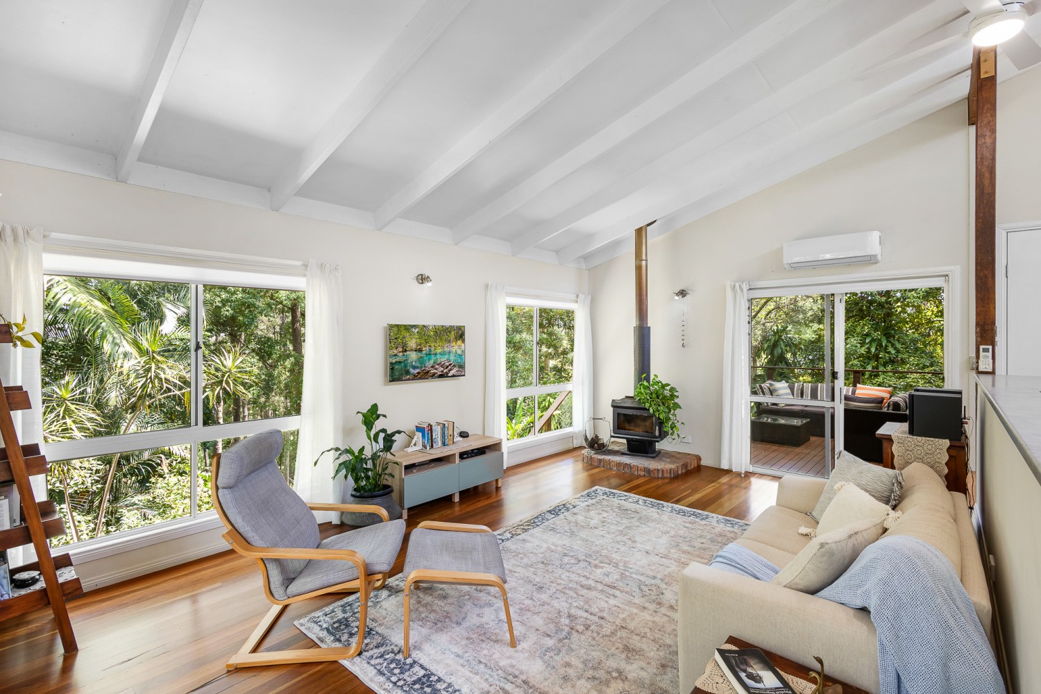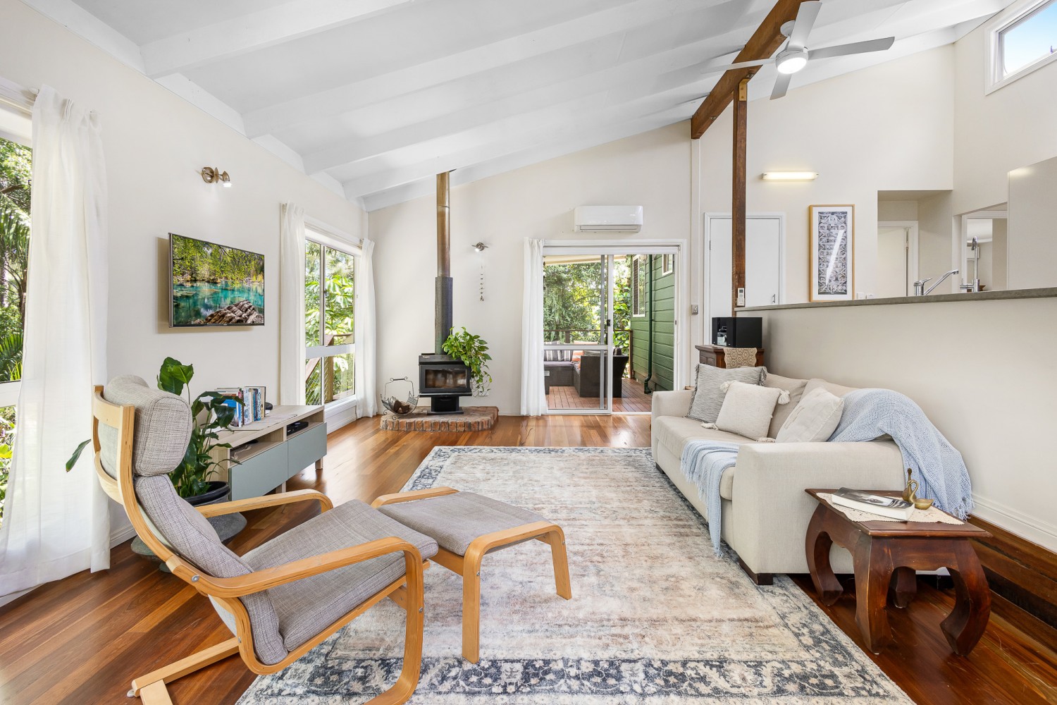 Inside, a galley-style kitchen with bamboo flooring adjoins a separate dining area. If you love to cook, you'll enjoy the 900mm gas cooktop. The kitchen overlooks the stepped-down lounge to the tree-tops beyond. High raked ceilings with exposed beams, polished timber floors in the lounge, and timber decks opening from both sides create a warm, character-filled atmosphere. And for those chilly nights, there's a wood-burning stove to warm you in more ways than one.
