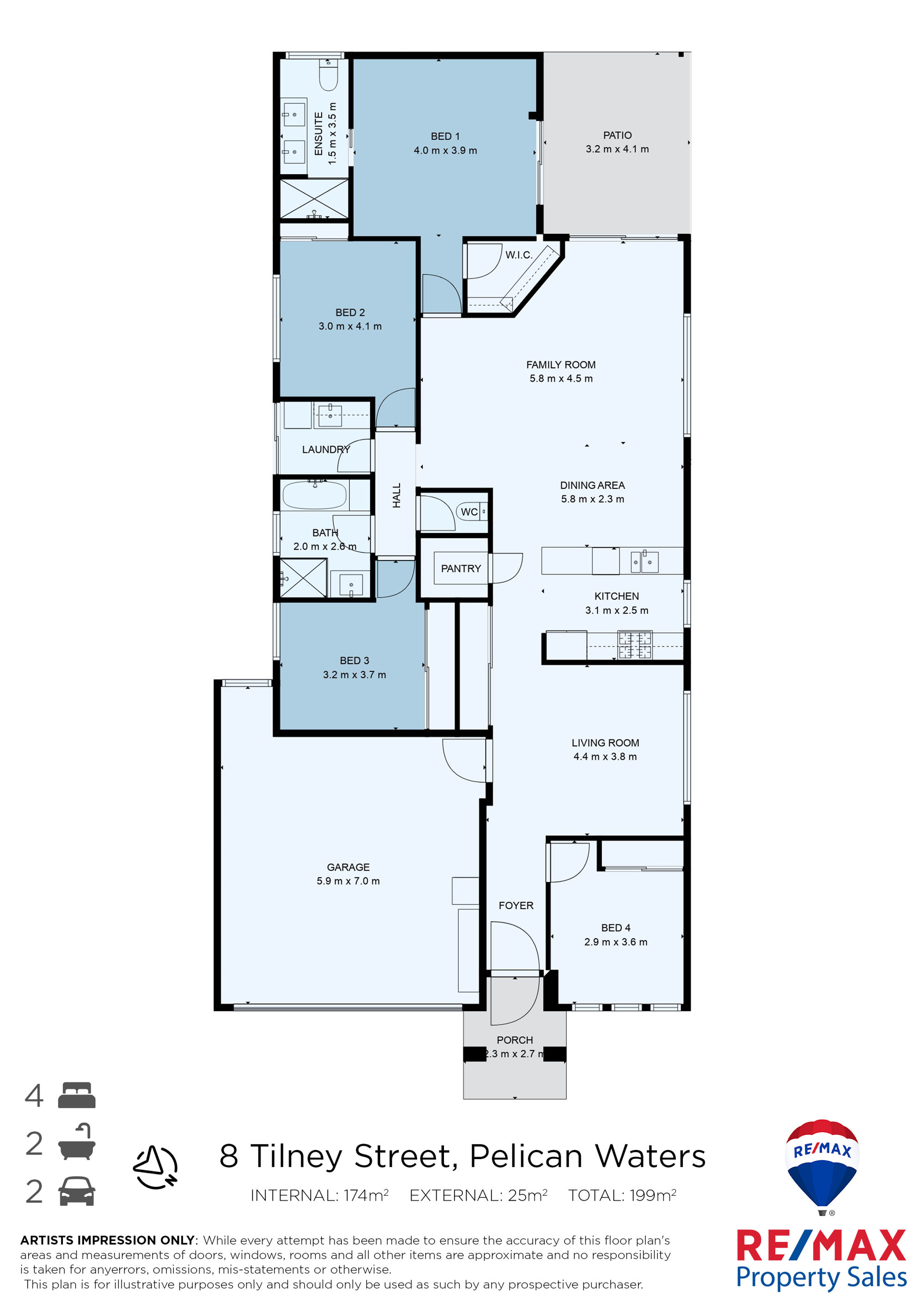 - Four bedrooms with ceiling fans and built-in robes (aircon in main & bedroom 3).