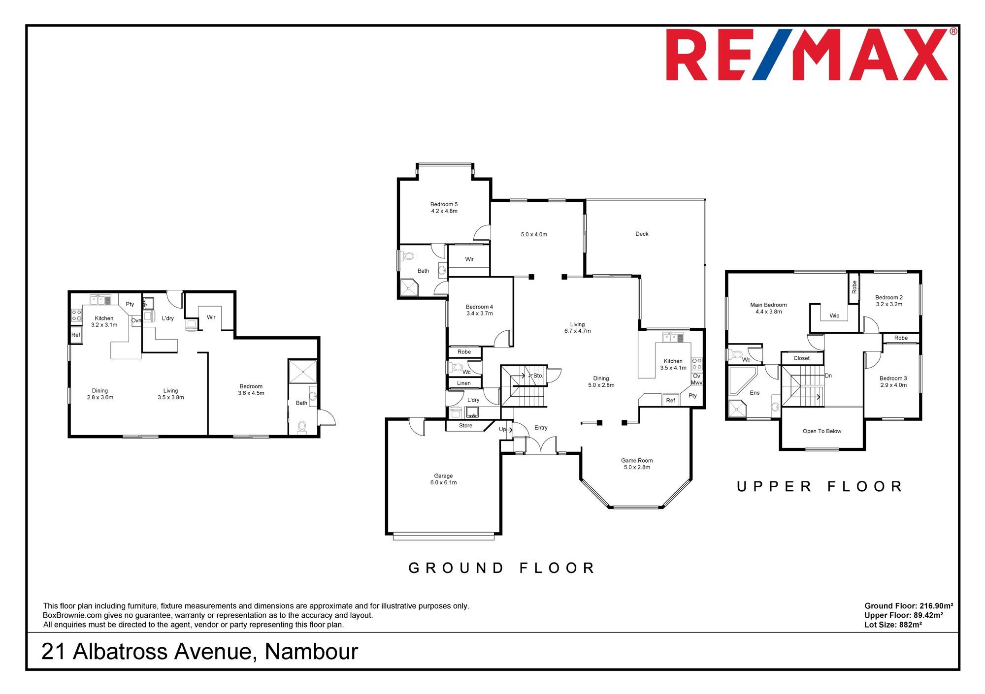 The layout includes a grand double-doored entry foyer, six bedrooms, three bathrooms plus a powder room, two kitchens, multiple living areas, an expansive deck, a covered terrace off the lower level, two laundries, and double lock-up garage, along with additional onsite parking for extra vehicles.
