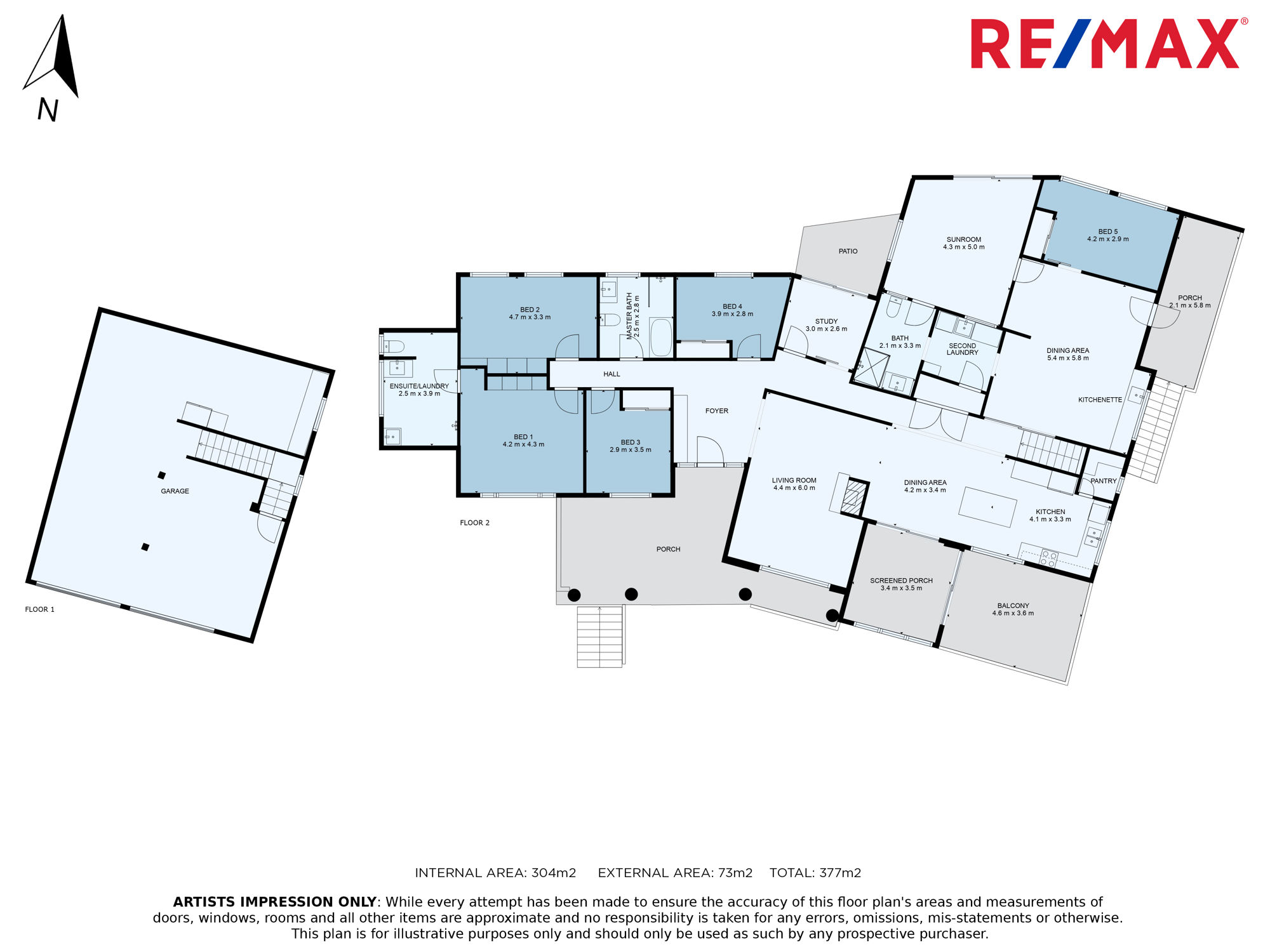 A highset design, the light-filled upper level comprises formal entry foyer, five bedrooms, three fully tiled bathrooms, study, separate living areas, stylish modern kitchen, kitchenette, multiple balconies, and two laundries. The ground floor consists of a triple lock-up garage with workshop/storage space plus double carport.