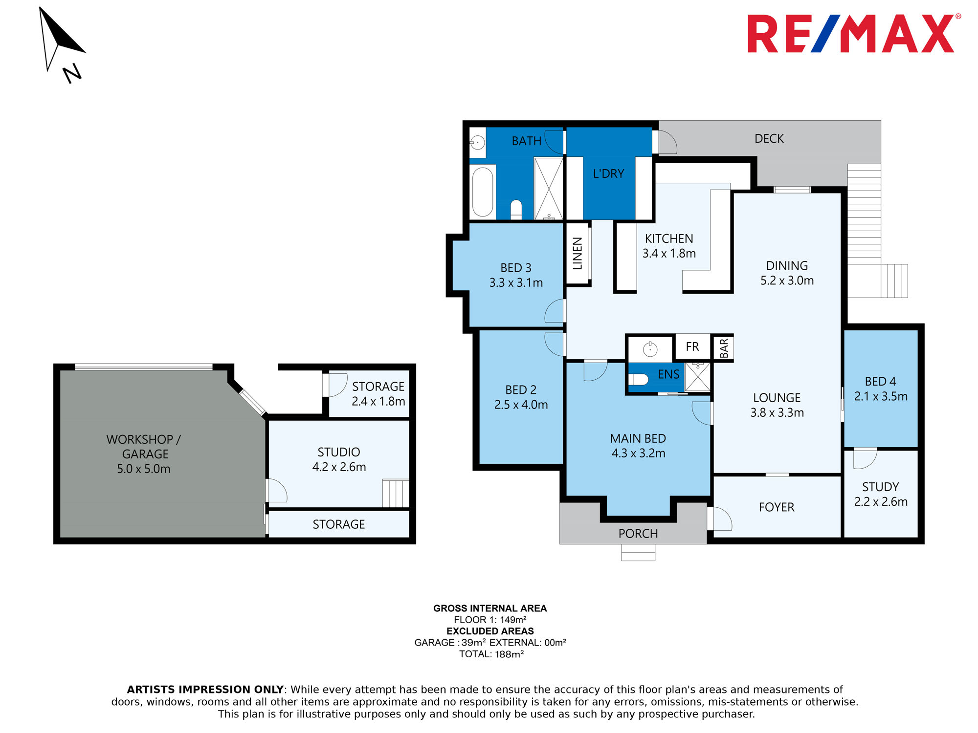 Beneath the home's main level is a private studio with both external access to the yard and internal access to the garage and workshop areas. This room offers itself to any number of possible purposes - it could be utilised as an office or consulting room for a home-based business, an art studio, music room or gym.