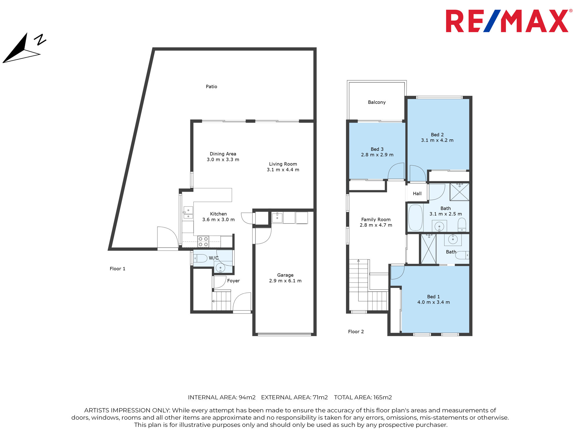 Across two light-filled levels it comprises formal entry foyer, three bedrooms, two bathrooms plus powder room, two separate living areas, upper balcony with sweeping vista, north-facing kitchen, huge 45m2 wraparound patio and courtyard (the largest in the complex), and single lock-up garage with laundry facilities.
