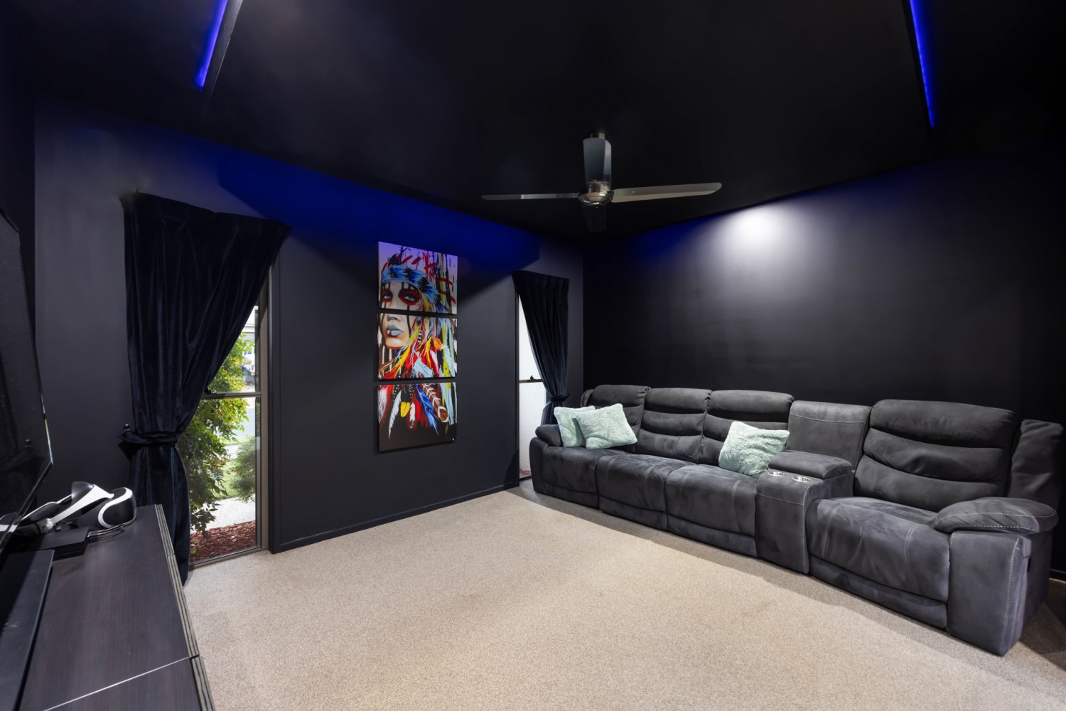 Integrated indoor to outdoor living also provides volumes of natural light to adorn the interior of the home. For a more private place to unwind, move into the spacious theatre with room for the entire family.
