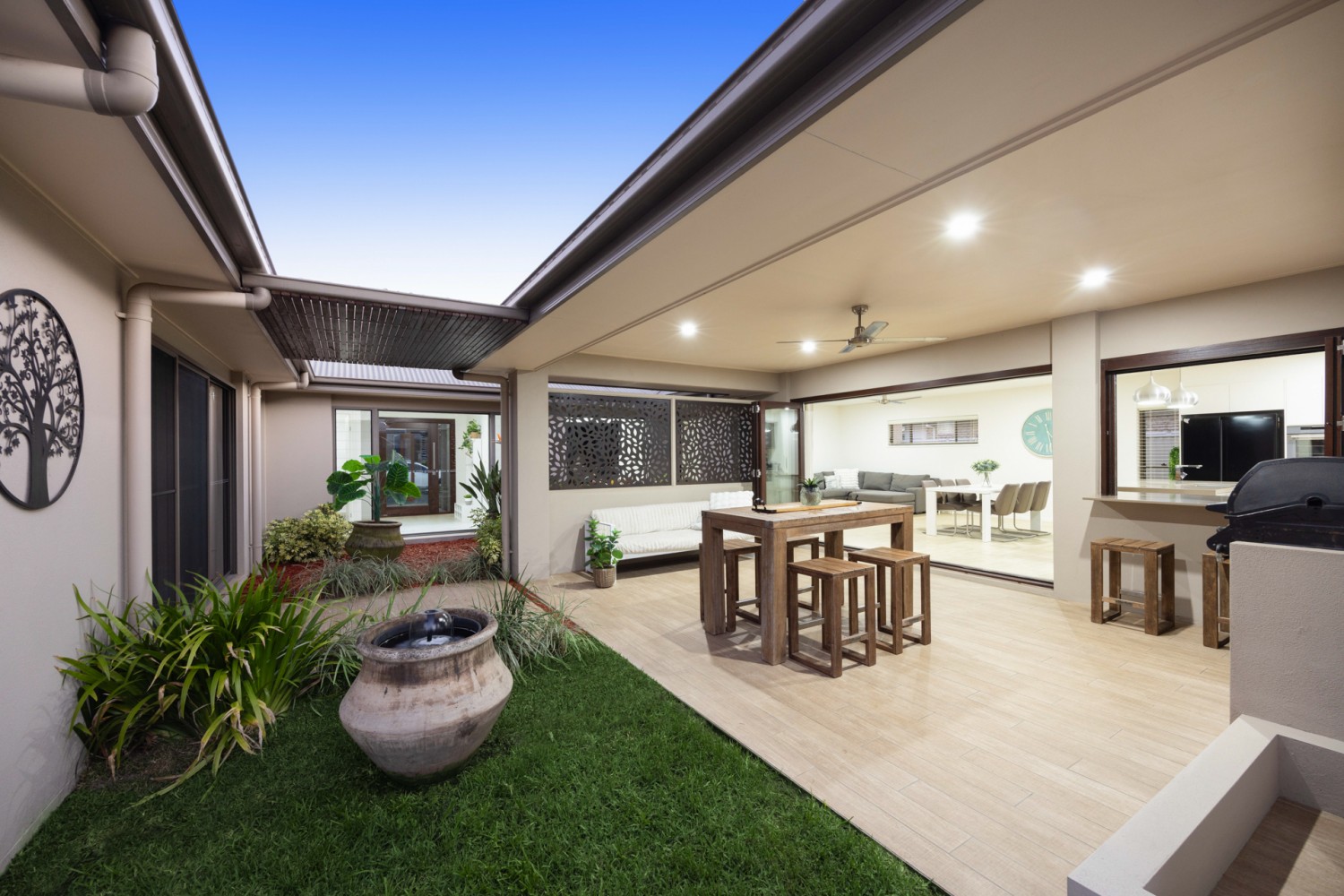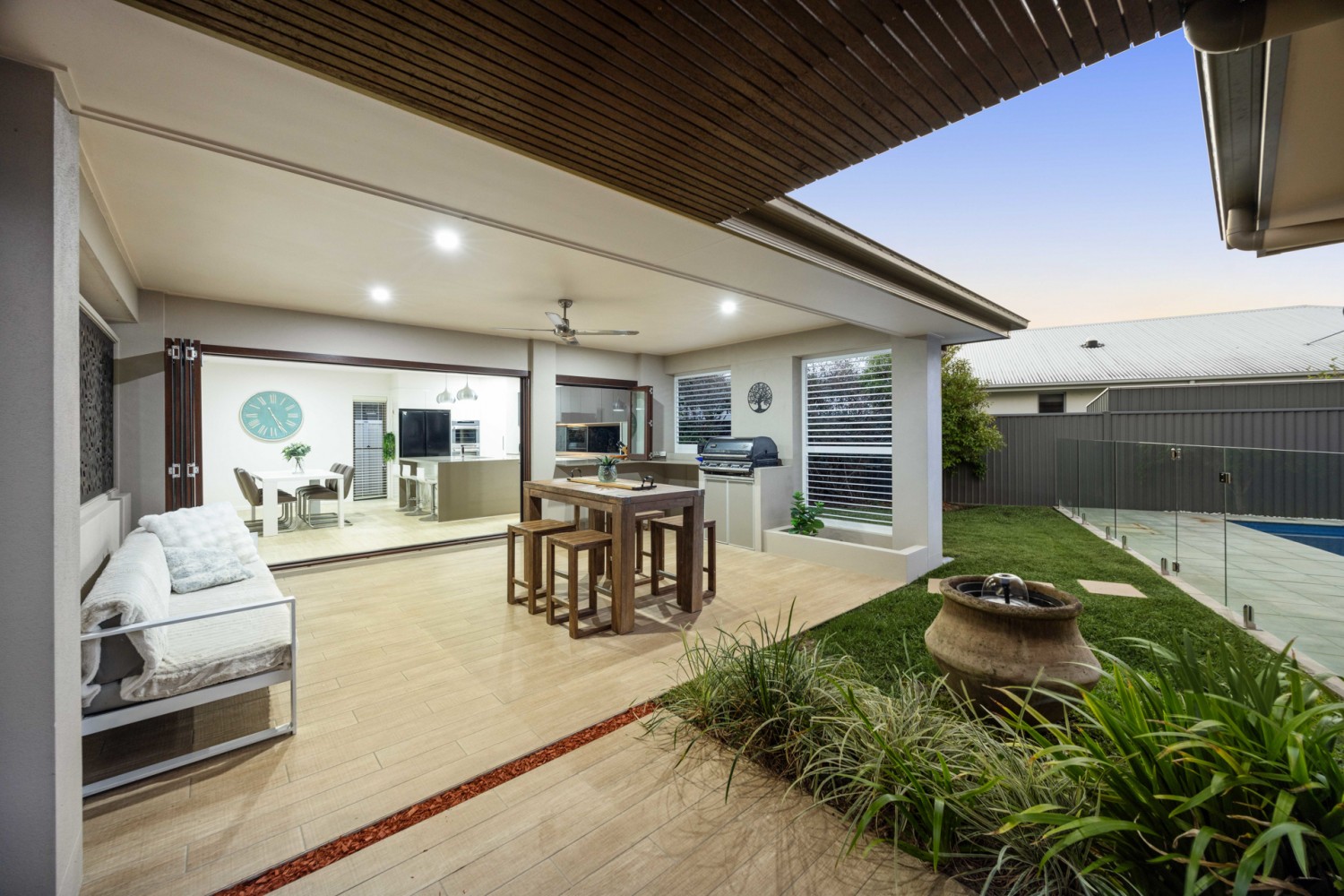 - Large entertainer's covered alfresco area with feature screens, outdoor kitchen, built-in barbecue and bar fridge