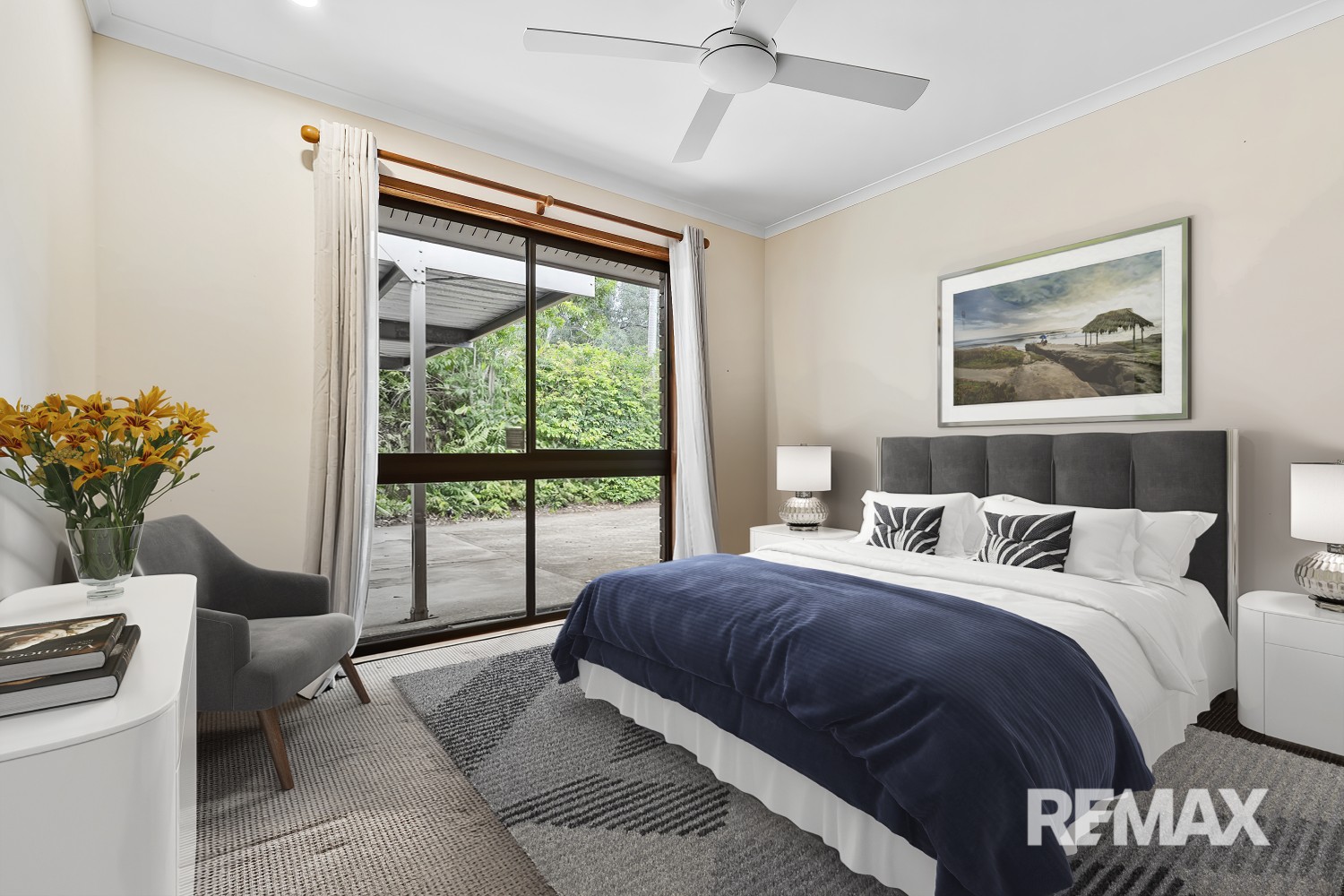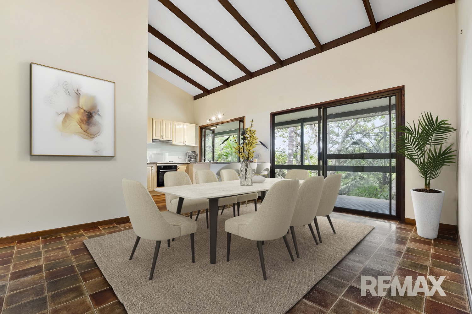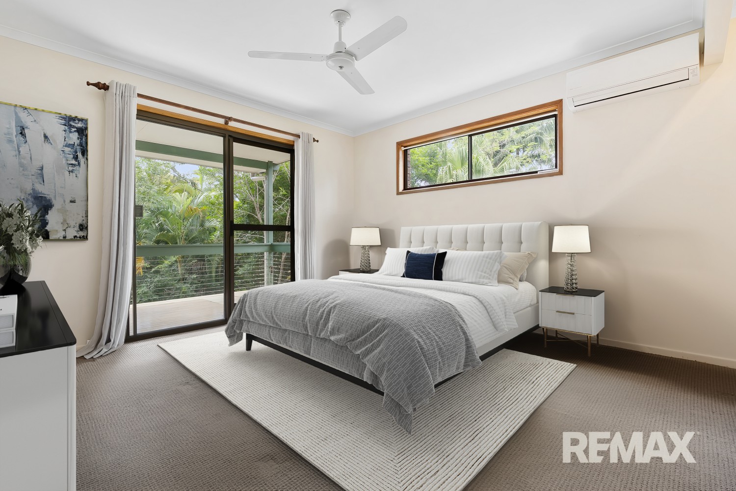 Features of the upper level (main home) include high vaulted ceilings in kitchen and living areas, bifold servery windows from kitchen to deck, separate shower and bath in main bathroom, 2 x split system air-conditioners, ceiling fans, and direct deck access from master bedroom.