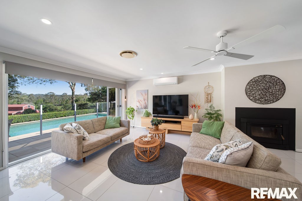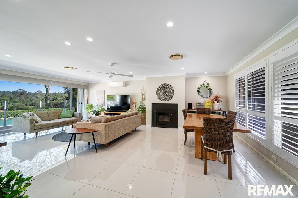 The main residence has been beautifully modernised, featuring a spacious open-plan design, ducted air-conditioning, striking louvers, and a central wood fireplace that anchors the living and dining zones with warmth and character. Oversized glass sliders open directly to the pool and alfresco area, creating the kind of effortless flow that defines Sunshine Coast living.
