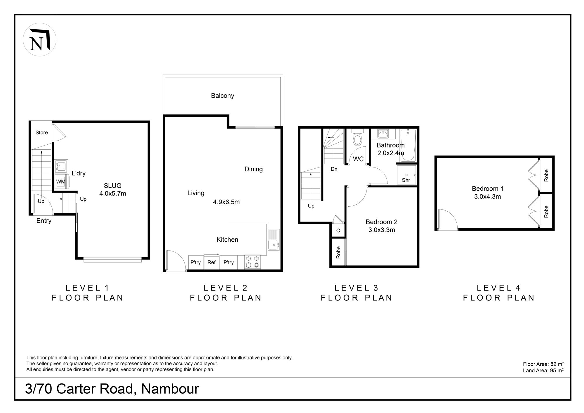 The home unfolds across four distinct levels, allowing each space to serve a clear purpose. Entry is via the ground level where a single lock-up garage, internal laundry and additional storage provide a functional base rarely achieved in comparable townhouses. The second level forms the central living hub, where the kitchen, dining and lounge are integrated into an open-plan configuration. The kitchen is efficiently laid out with wraparound bench space and ample cabinetry, connecting directly to the dining area, while the adjoining living space flows to a private balcony that introduces light and airflow without ongoing maintenance.