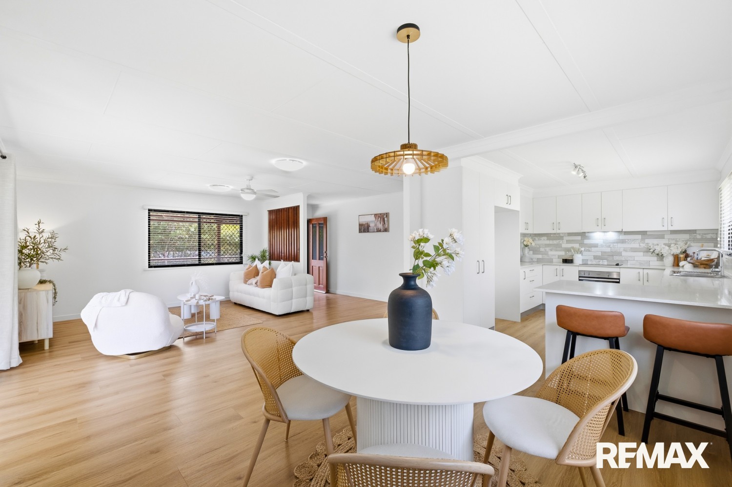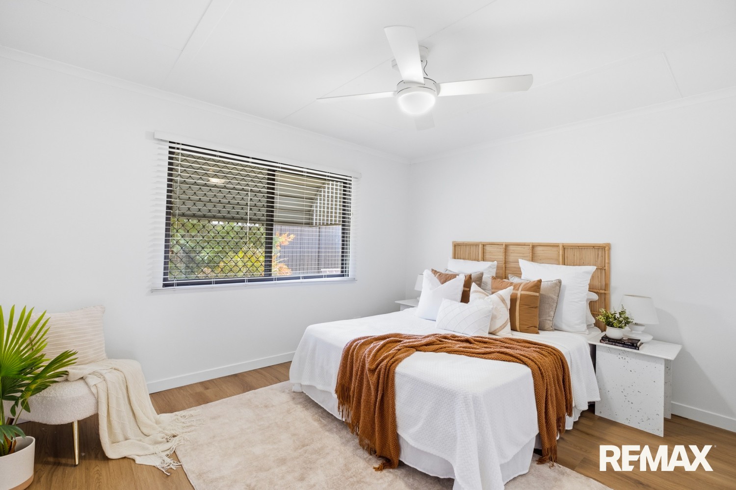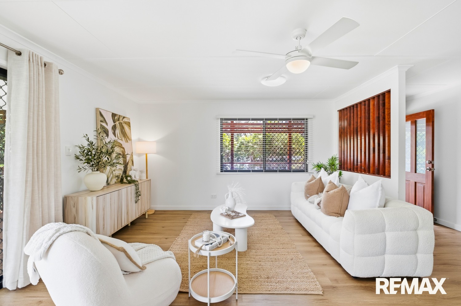 Internally, timber look flooring and a neutral colour palette create cohesion throughout the living zones. Ceiling fans, practical storage and a walk in robe to the main bedroom enhance everyday comfort. The layout separates sleeping quarters from primary living areas, supporting both privacy and noise control.