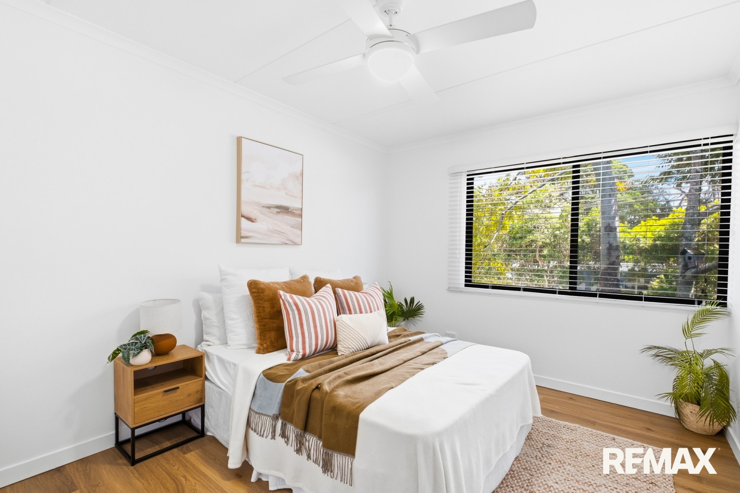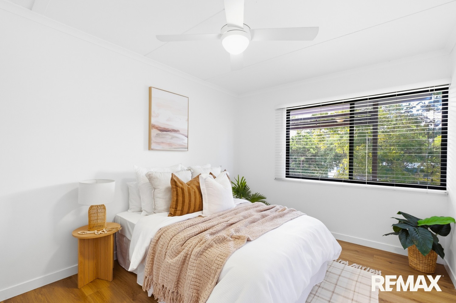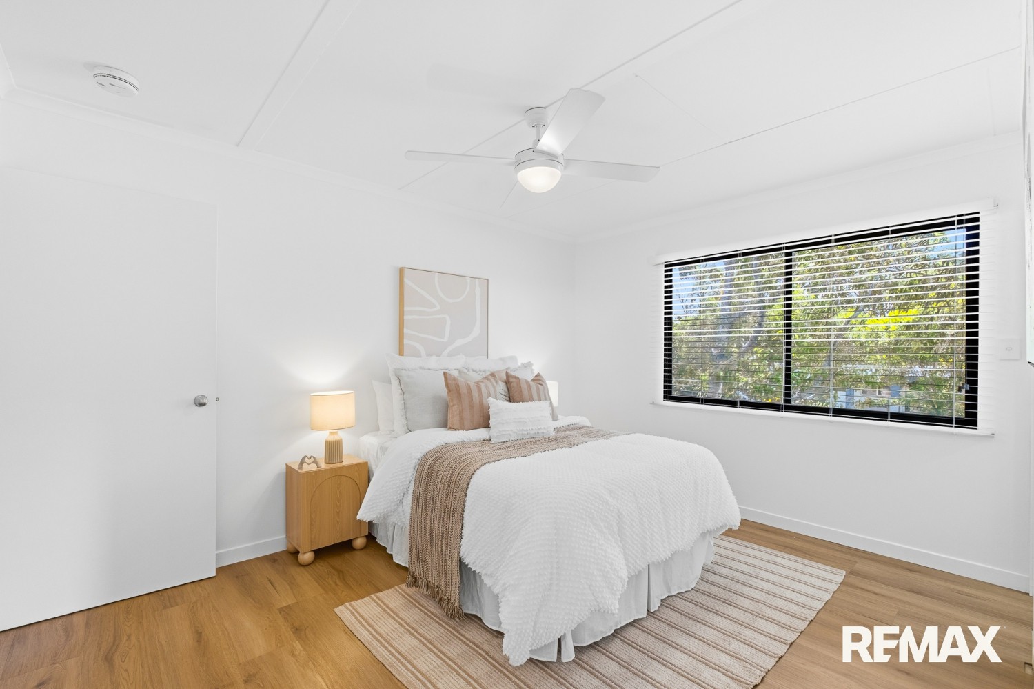 Internally, timber look flooring and a neutral colour palette create cohesion throughout the living zones. Ceiling fans, practical storage and a walk in robe to the main bedroom enhance everyday comfort. The layout separates sleeping quarters from primary living areas, supporting both privacy and noise control.