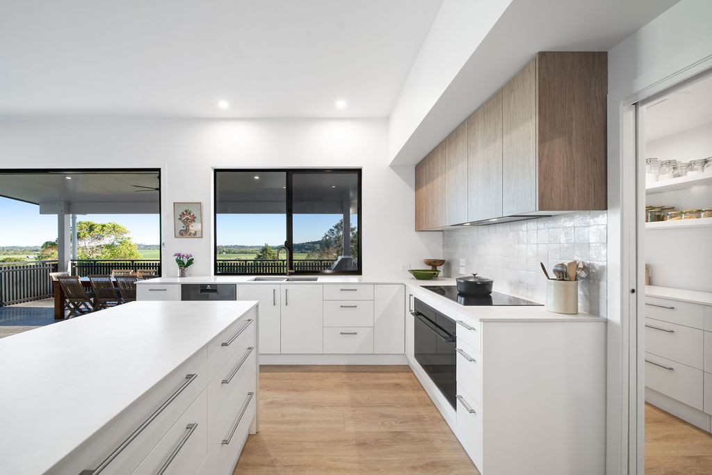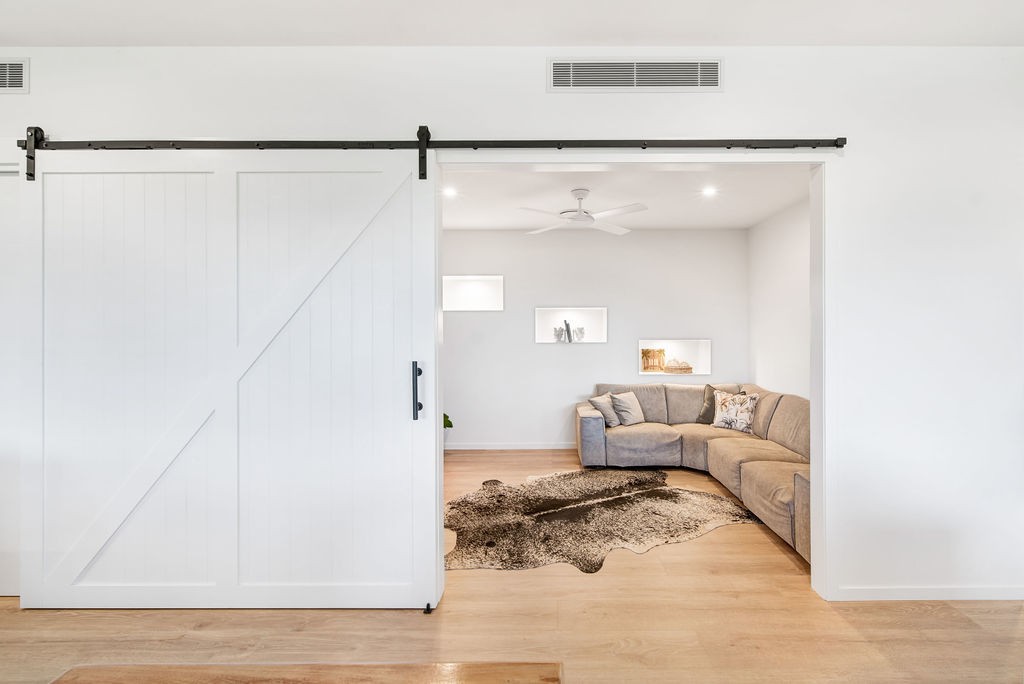 The central living area - combining kitchen, dining and living zones - has an open-plan sense of spaciousness that is emphasised by high ceilings and sliding stacker doors that open wide onto a broad balcony with spectacular far-reaching views and a built-in BBQ entertainment area. In addition, a media/theatre room adjoins the central living zone, its large sliding barn door allowing it to be as open or closed to the main area as you desire.
