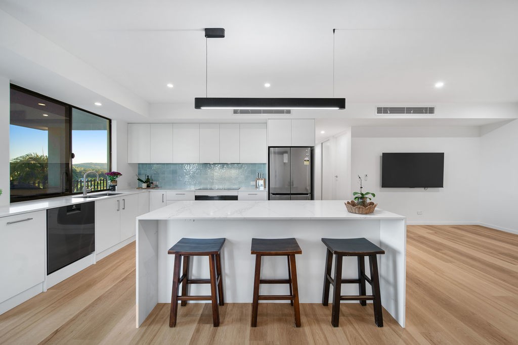 The upper level of the home hosts three bedrooms plus a home office/fourth bedroom with external access. The master bedroom is outfitted with a huge walk in wardrobe and generous ensuite, and is positioned to take full advantage of the home's elevation, offering expansive wrap-around views.