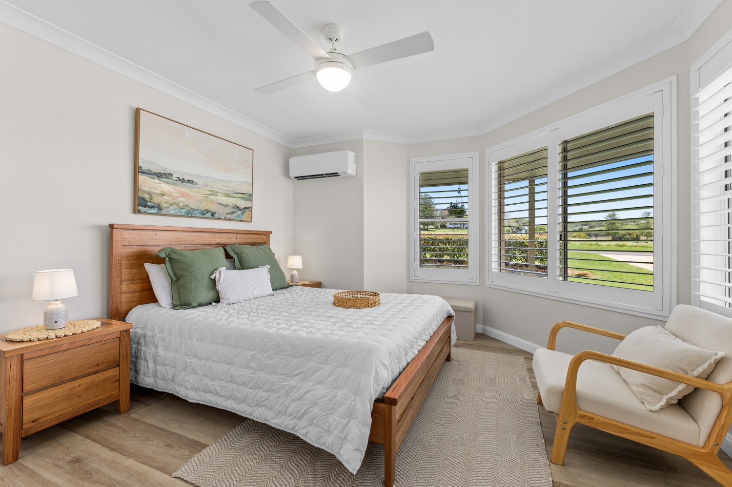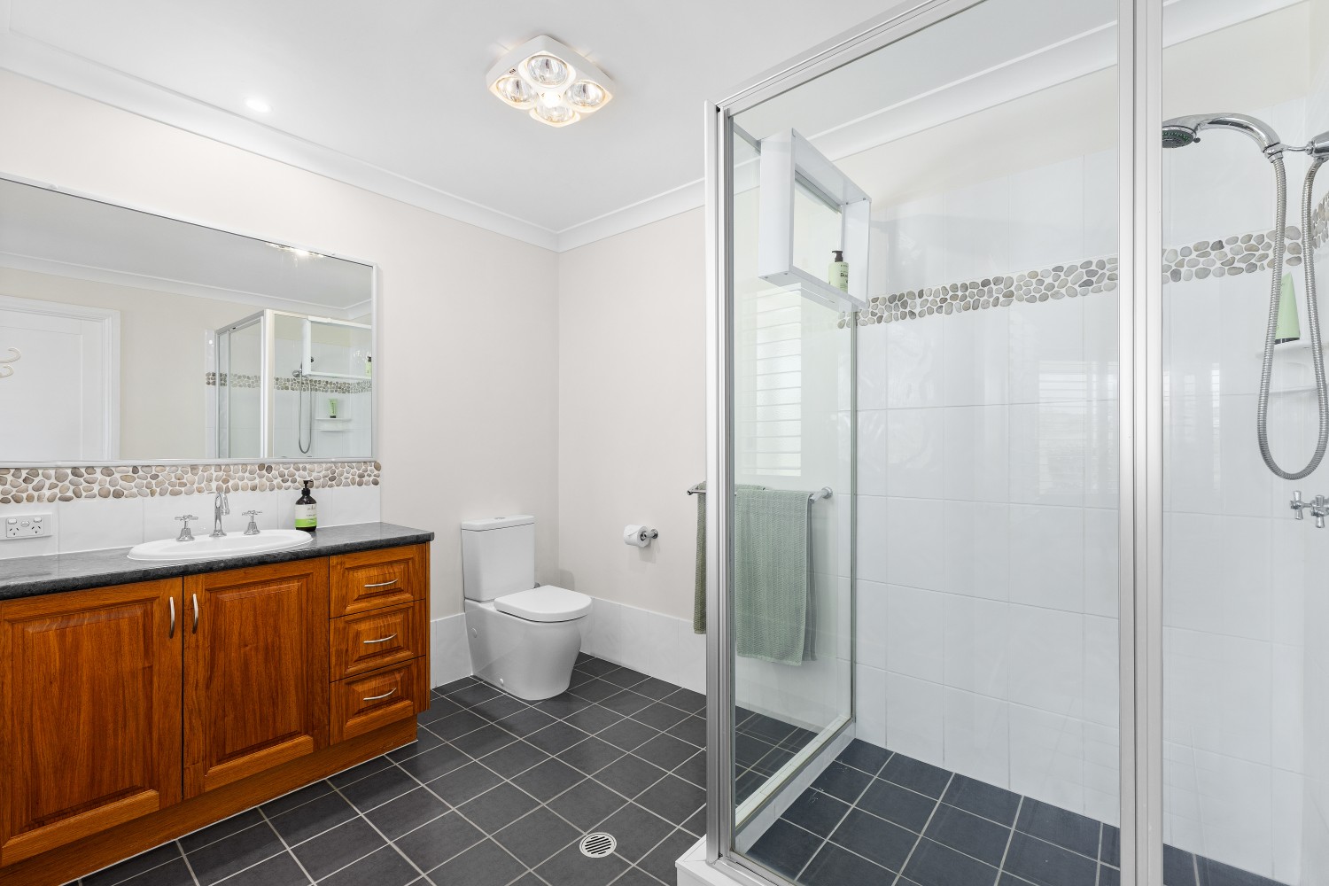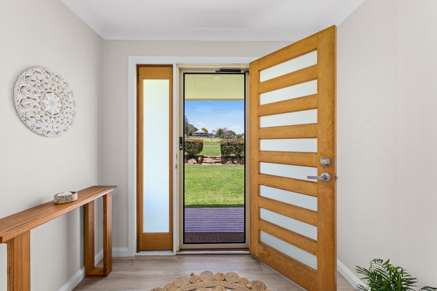 With a beautiful spotted gum deck at the entrance and hybrid flooring, this home boasts five bedrooms plus a study, all of which feature elegant plantation shutters, Mucheln door handles, built in wardrobe storage, and reverse cycle air-conditioning plus a ceiling fan. The master bedroom has ensuite, spacious walk-in wardrobe, and a broad bay window that enjoys views across a tranquil rural vista. A studio with its own ensuite and separate external entrance offers dual living or home-based business potential, and the zoning of this property - Low Density Residential - allows scope for an additional granny flat or for subdivision (subject to Council approval).