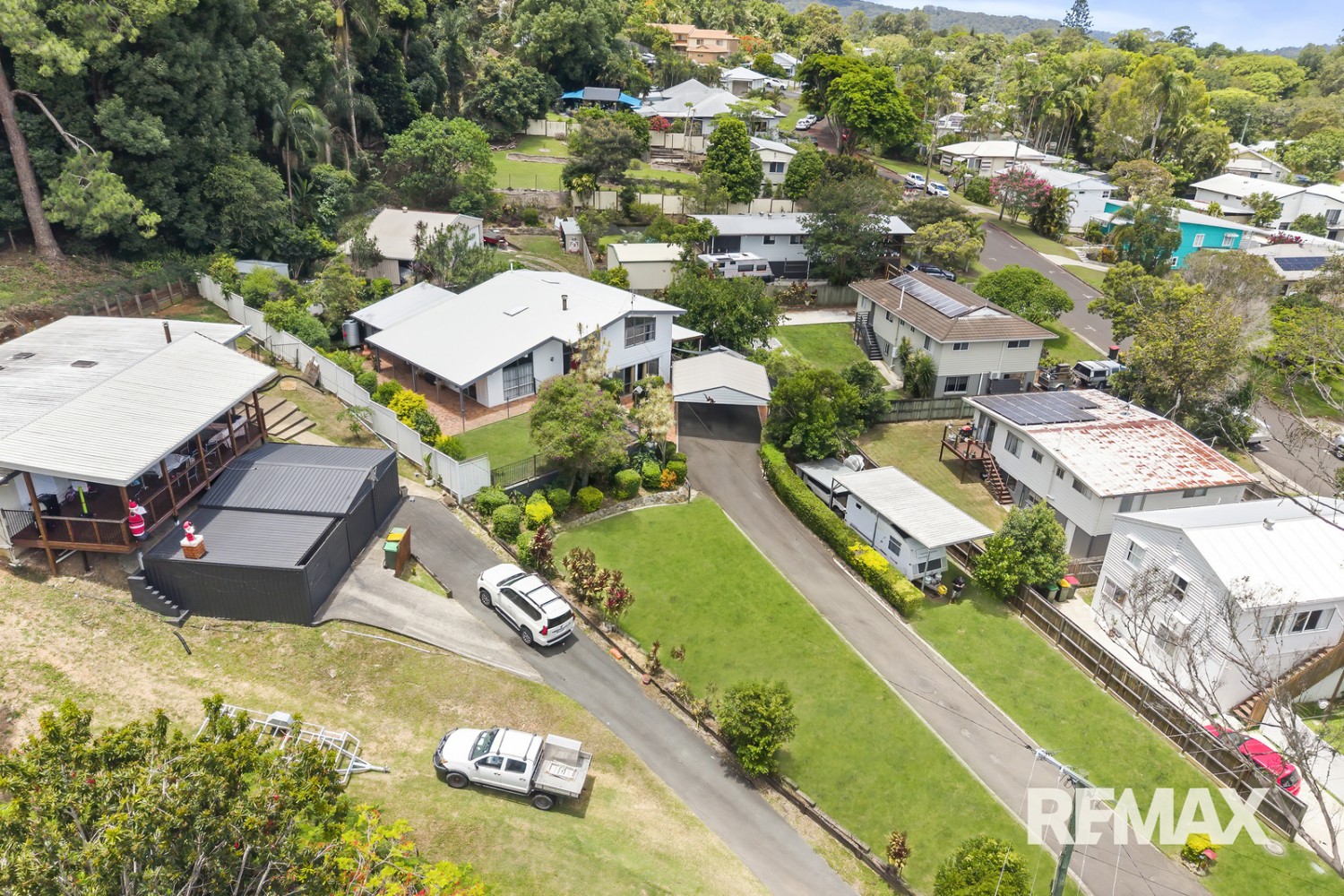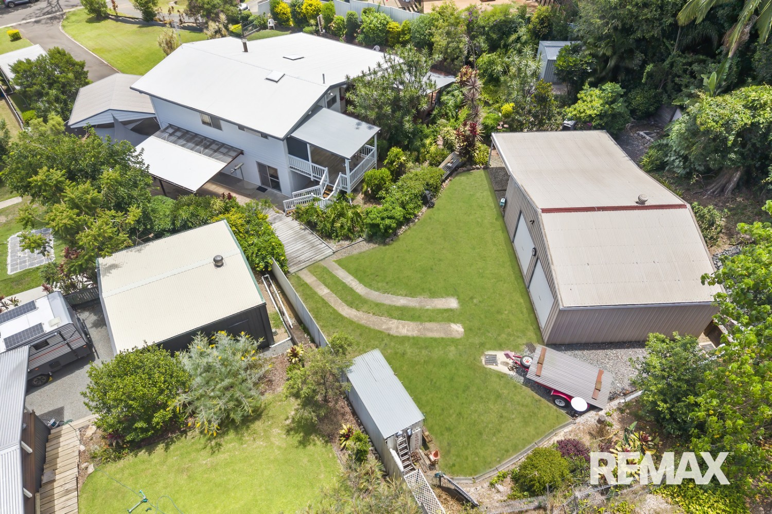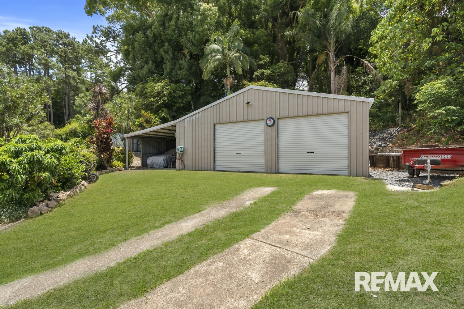Infrastructure on the property includes 8x4-metre caravan port with 3m clearance, 7x9-metre powered shed with extra-high doors and 4.7x7-metre annex, parking bay for trailer, lock-up garden shed, 2 x water features (with pump and lights), water tank on outdoor deck, and fencing.