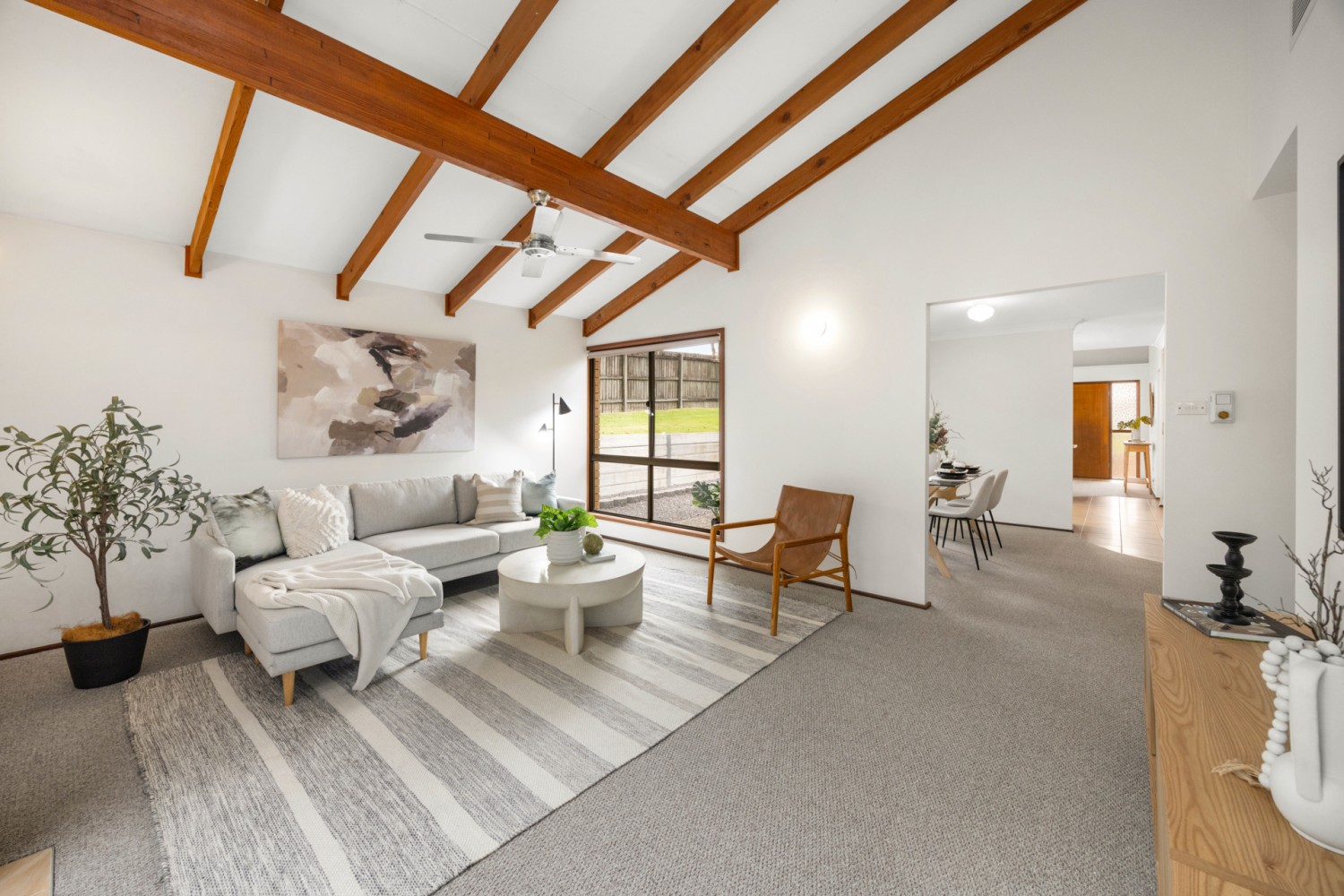 At the heart of the home, the functional kitchen adjoins the formal dining area, offering ample space to create and serve culinary delights. This flows seamlessly into the light-filled living/media room, creating an inviting hub for family connection while the formal lounge features raked ceilings and provides the ideal zone for larger families, relaxed everyday living or entertaining. Stunning raked ceilings are featured across both living areas.