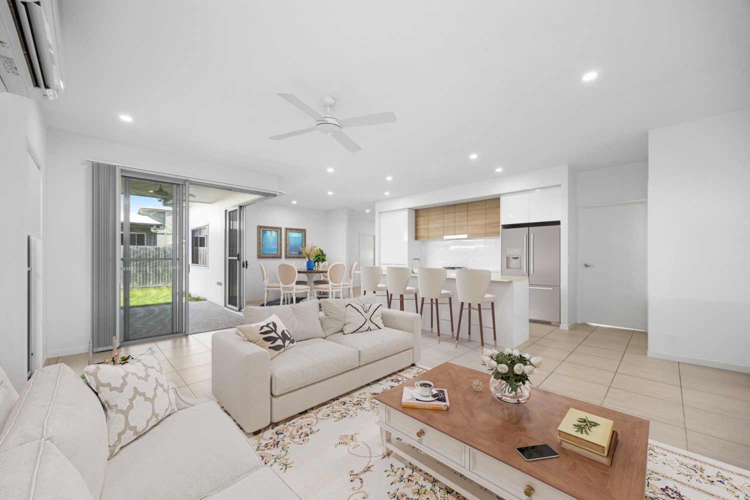 The air-conditioned open plan living and dining area flows seamlessly to a covered alfresco space, making it ideal for entertaining or relaxing with family and friends.