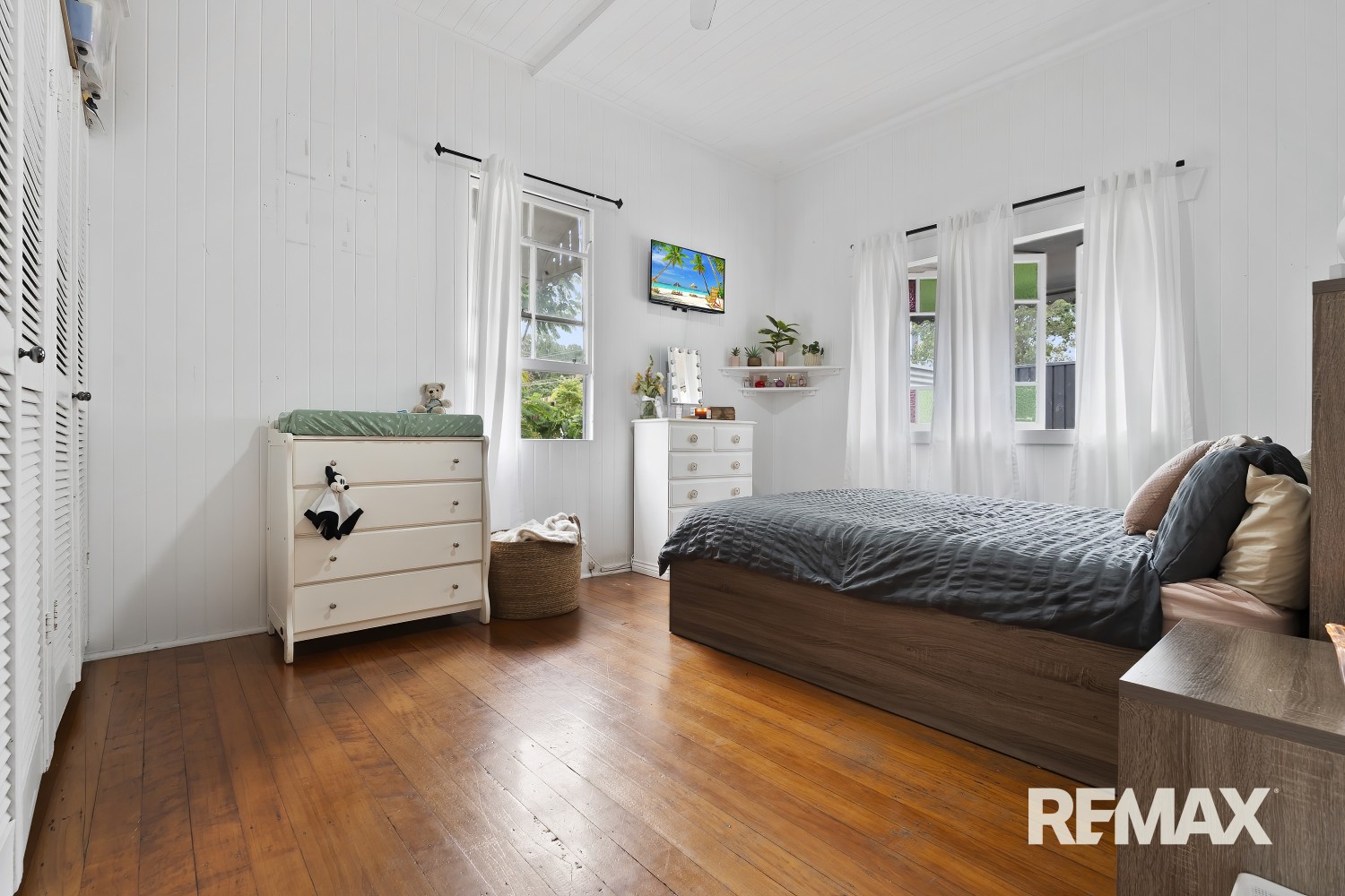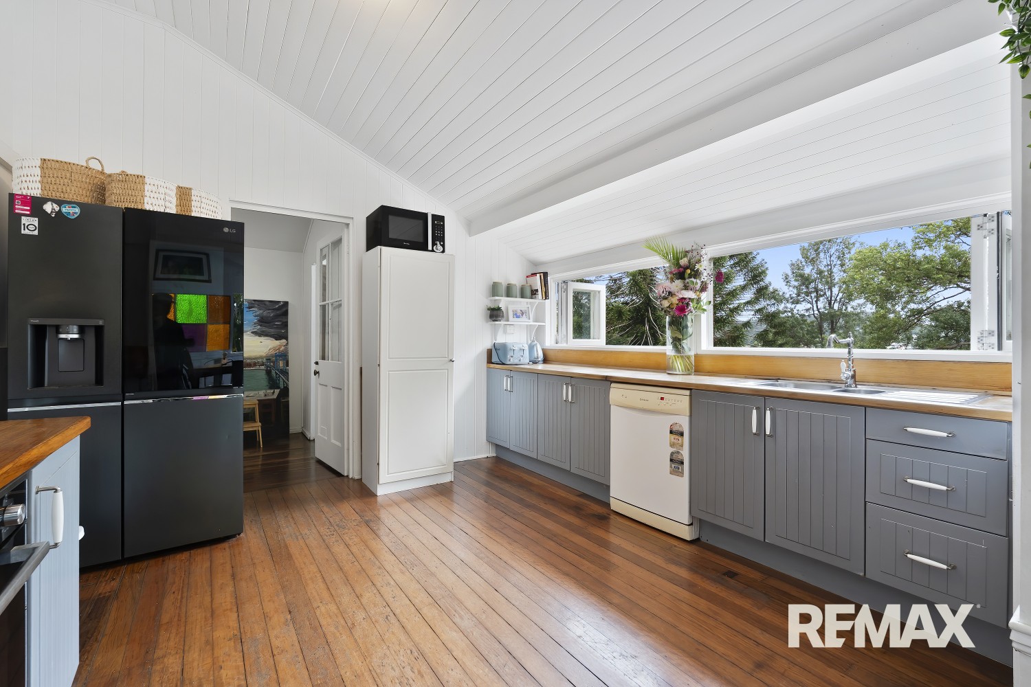 Open-plan living areas continue the theme of hardwood floors and high ceilings, with air conditioning in the main living area and master bedroom ensuring year-round comfort. The kitchen blends modern functionality with a charming country-style aesthetic.