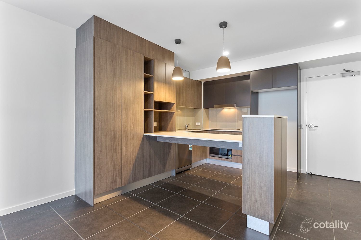 * Open-plan family/meals area Modern kitchen with stone benchtop & stainless steel appliances