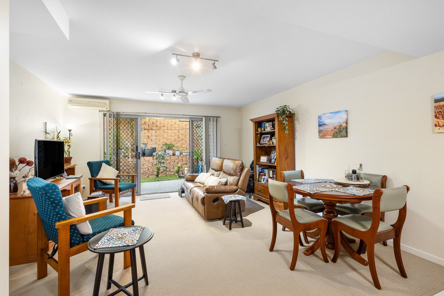 Downstairs, the open-plan living and dining area offers generous proportions and excellent natural light, flowing seamlessly to the private rear courtyard. This outdoor space is paved for easy care and framed by established greenery and terraced garden beds, creating a quiet retreat ideal for morning coffee, relaxed evenings, or entertaining guests.