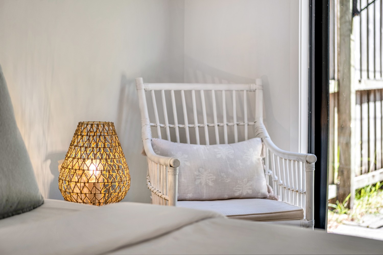 - The first of the two bedrooms has a queen-sized bed and glass sliding doors that extend out to the backyard.