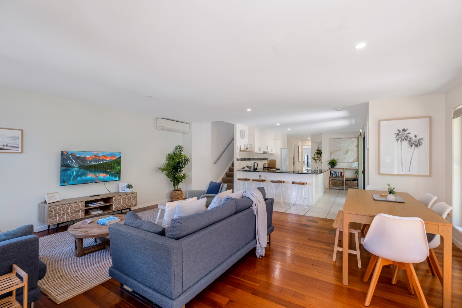 - Downstairs: Open plan living & full equipped kitchen with island bench seating, appliances including large fridge, microwave, dishwasher, oven, and cook top.