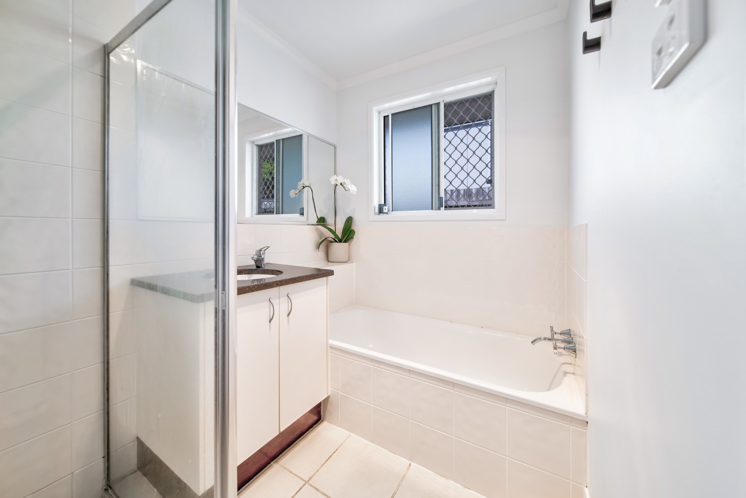 A light-filled bathroom includes both a shower and bathtub, complemented by a separate toilet and internal laundry for added functionality.